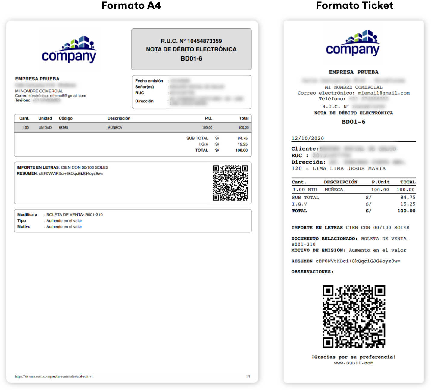 Da clic en “Guardar” para emitir la nota de débito. Susii te ofrece la opción de imprimirla en 2 formatos, ticket y A4, o envíala por correo a tu cliente.