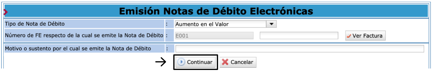 Selecciona el tipo de nota de débito y escribe el número de factura. Para verificar si la factura a modificar es correcta, haz clic en “Ver factura”.
