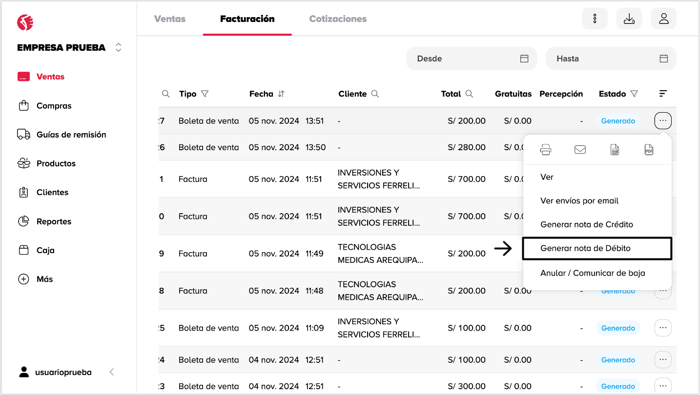 En la parte derecha del comprobante haz clic sobre los 3 puntos. Se desglosará una lista de opciones, elige “Generar nota de Débito”.