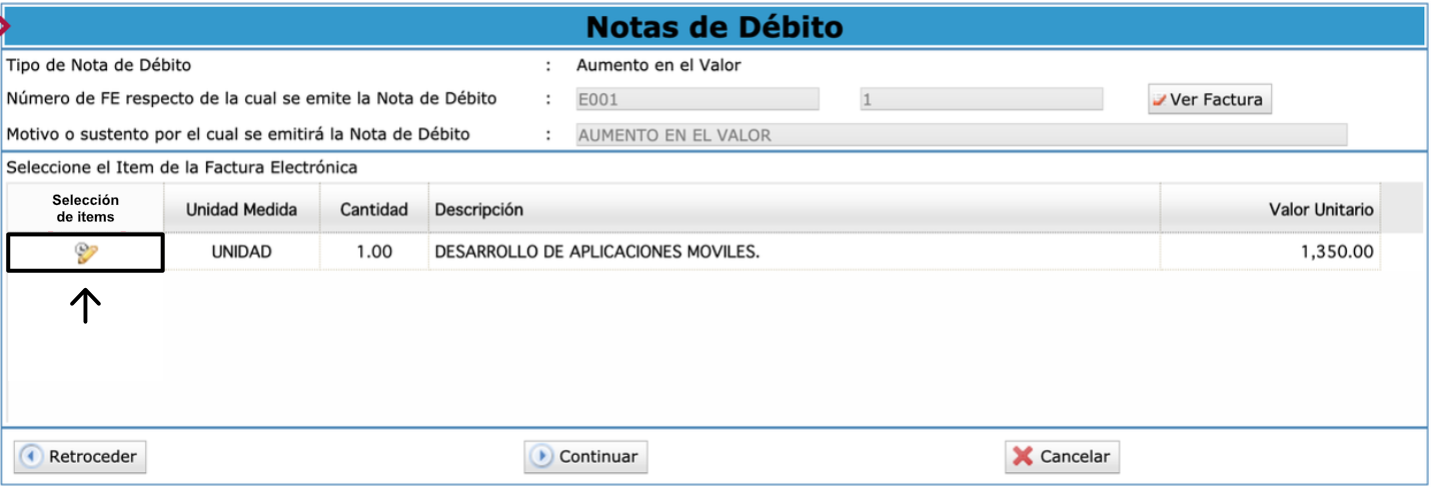 Automáticamente Susii cargará la factura o boleta a modificar, completa tipo y motivo de la nota de débito.