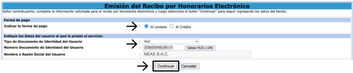 Tipo, número de documento y dar clic en “Validar RUC o DNI” para que aparezca el nombre o la razón social, verificar el nombre o razón social del Usuario. Clic en “Continuar”.