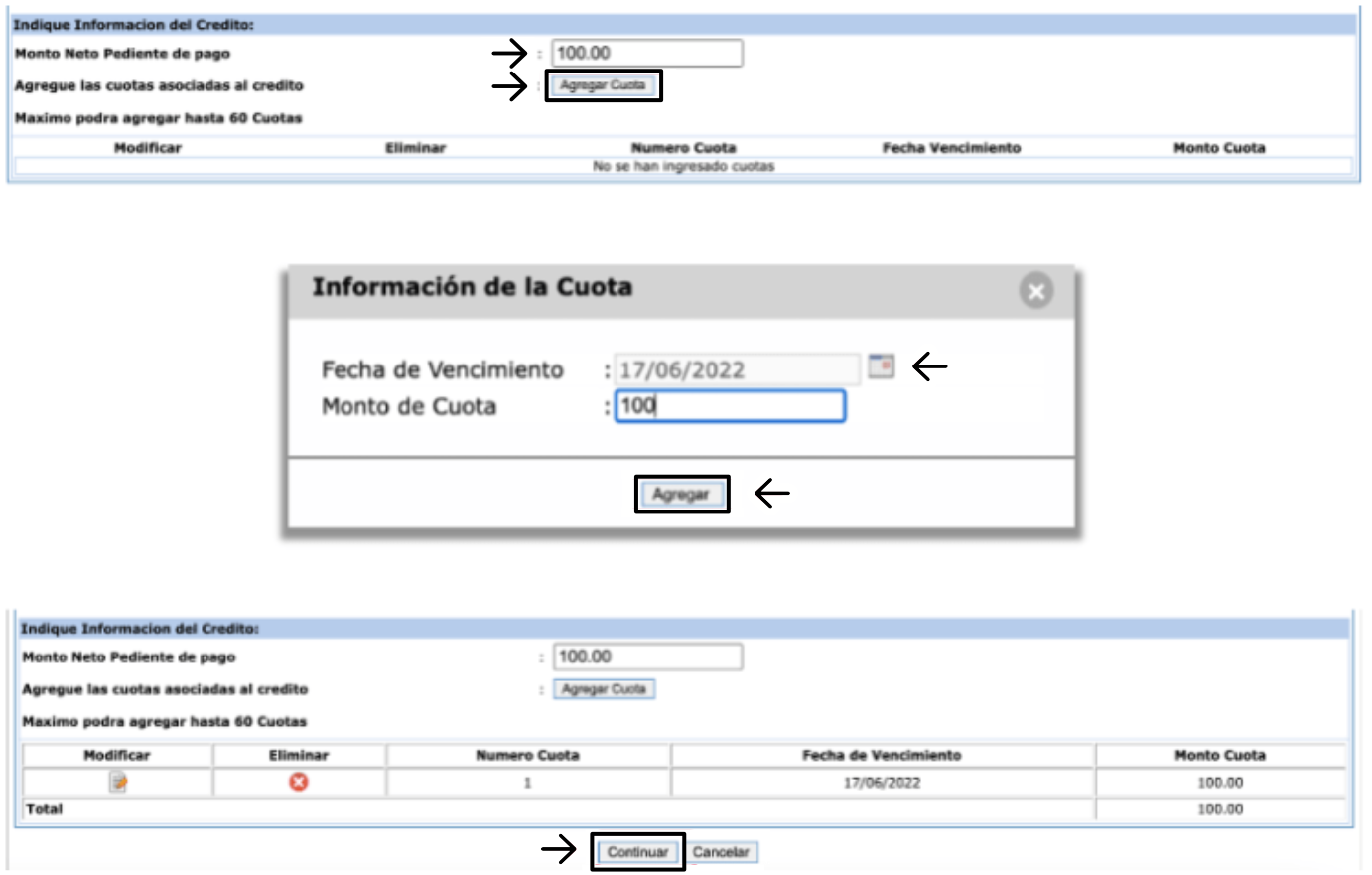 Indique Información del Crédito: Coloque el monto neto pendiente de pago y las cuotas de pago en “Agregar Cuota”. Ahora registre la “Fecha de Vencimiento”, “Monto de Cuota” y finalmente dar clic en “Agregar”.