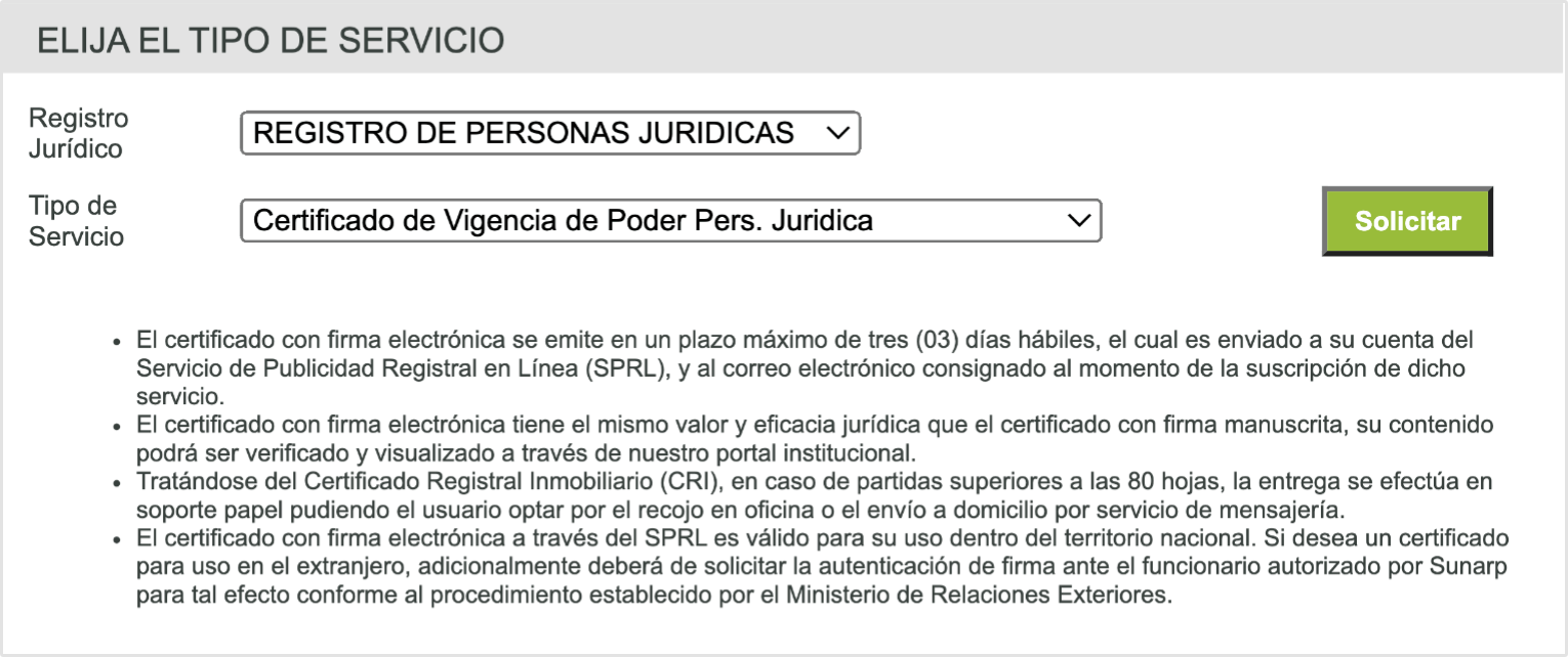 En tipo de servicio selecciona “Certificado de vigencia de poder Pers. Jurídica” y luego clic en solicitar.