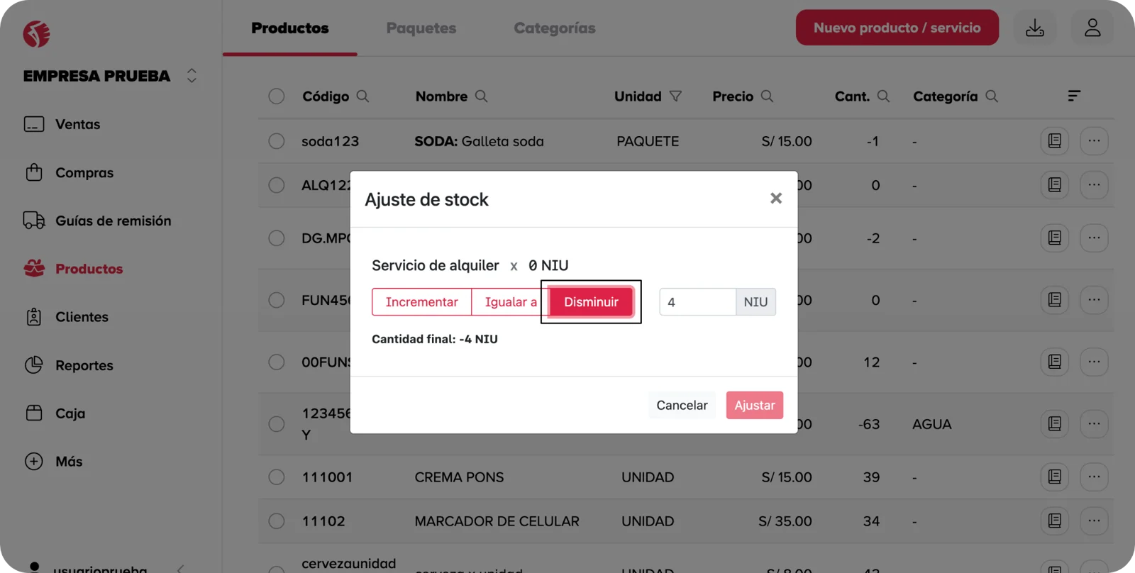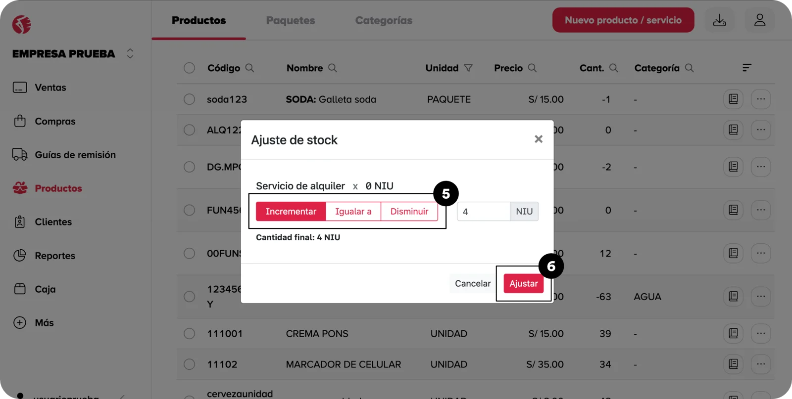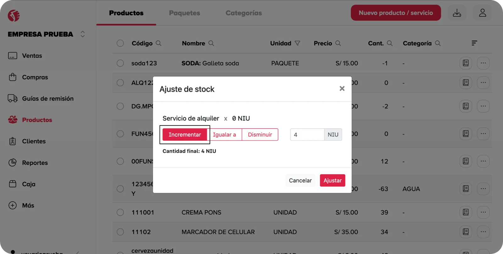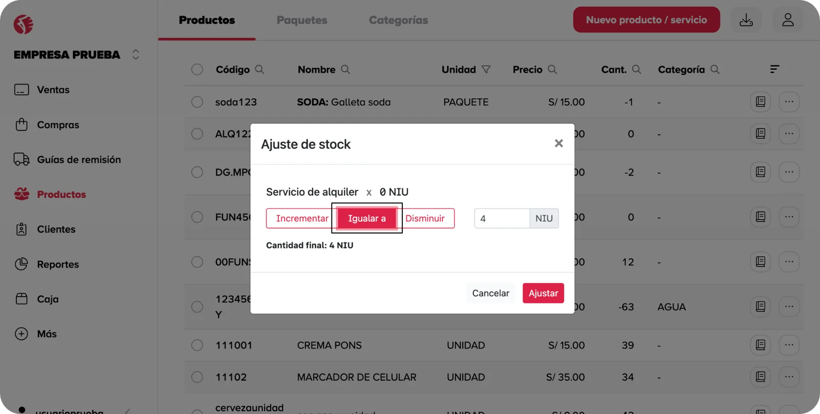 - En la ventana desplegada, encontraras opciones para incrementar , igualar a o disminuir tu stock actual. Estas opciones se describen en la siguiente sección.