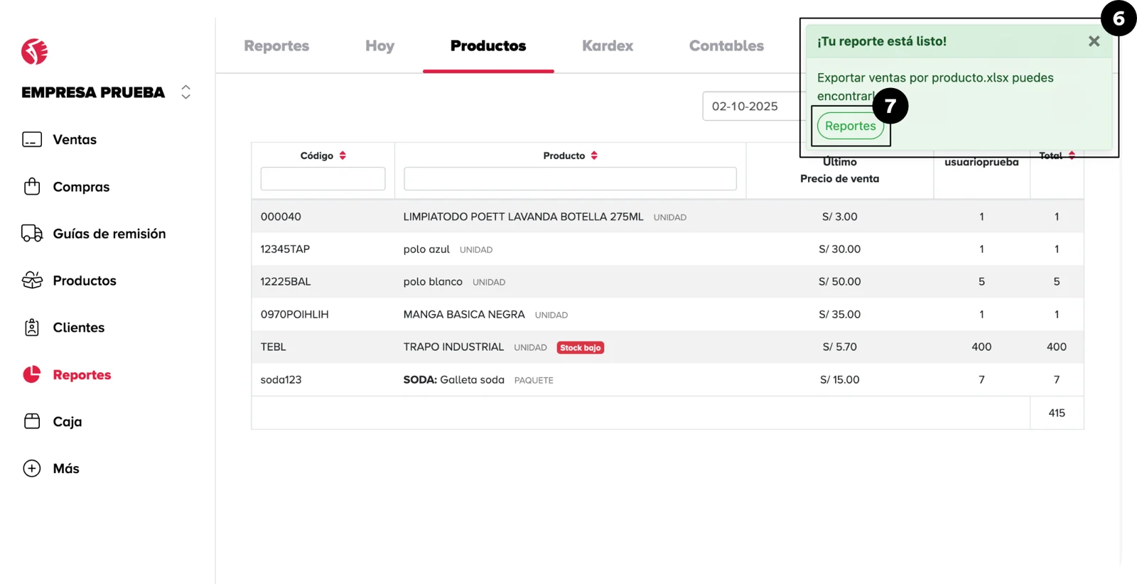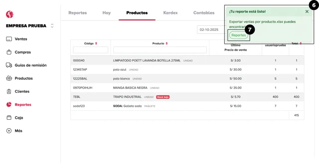 El sistema procesará tu reporte y, cuando esté listo, verás una notificación verde en la esquina superior derecha.