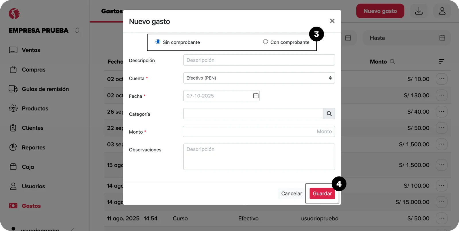 - En la ventana desplegada puedes escoger si el gasto se realizó Sin comprobante o Con comprobante.