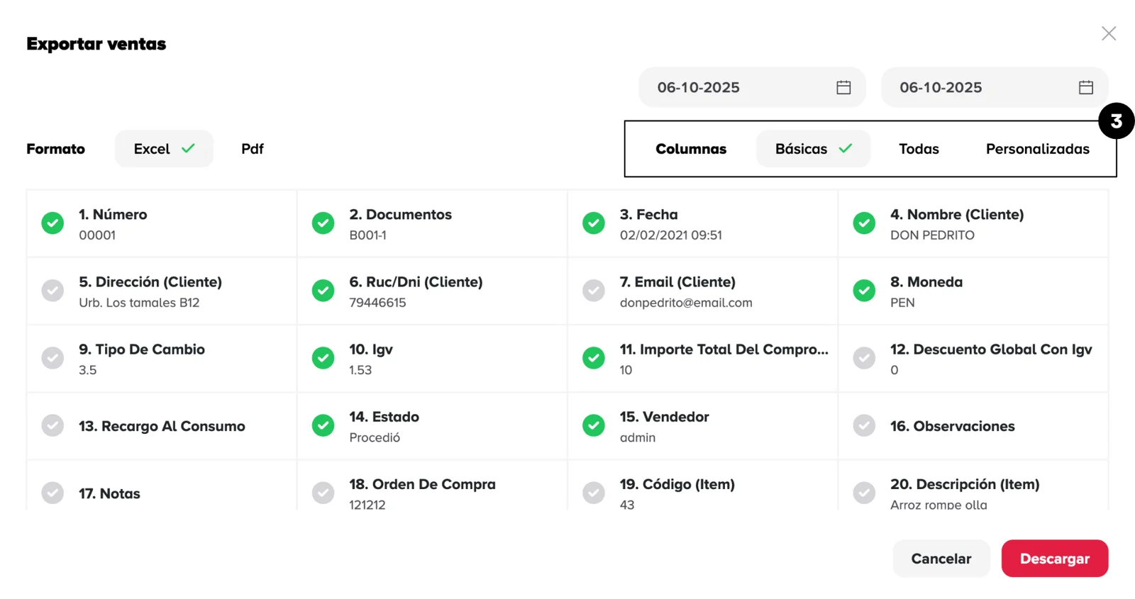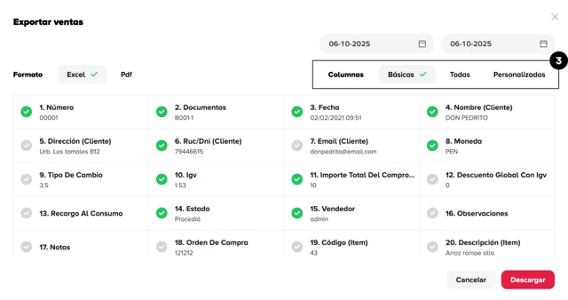 En la ventana emergente, elige el rango de fecha, el formato y las columnas que desees incluir. Puedes seleccionar: