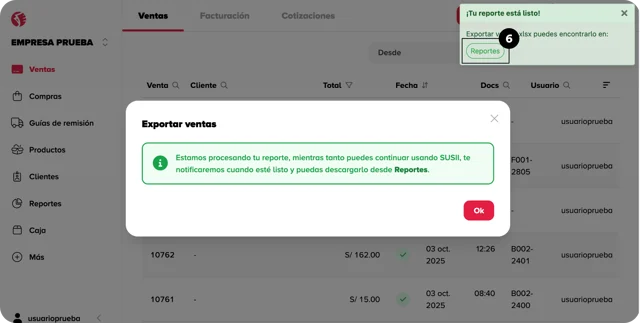 El sistema comenzará a procesar tu reporte y una vez listo te mostrará una notificación verde en la esquina superior derecha.