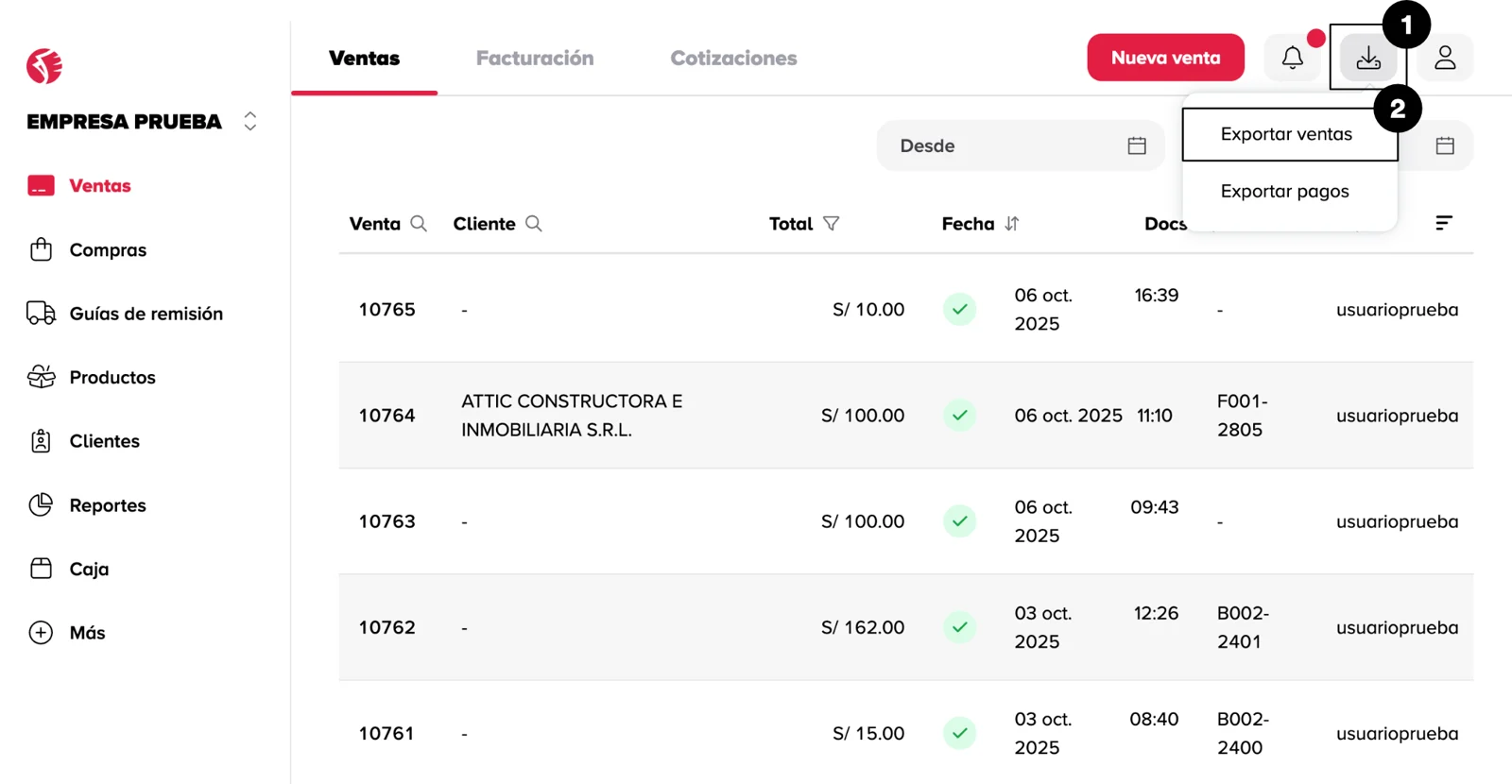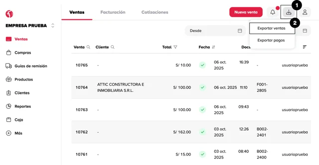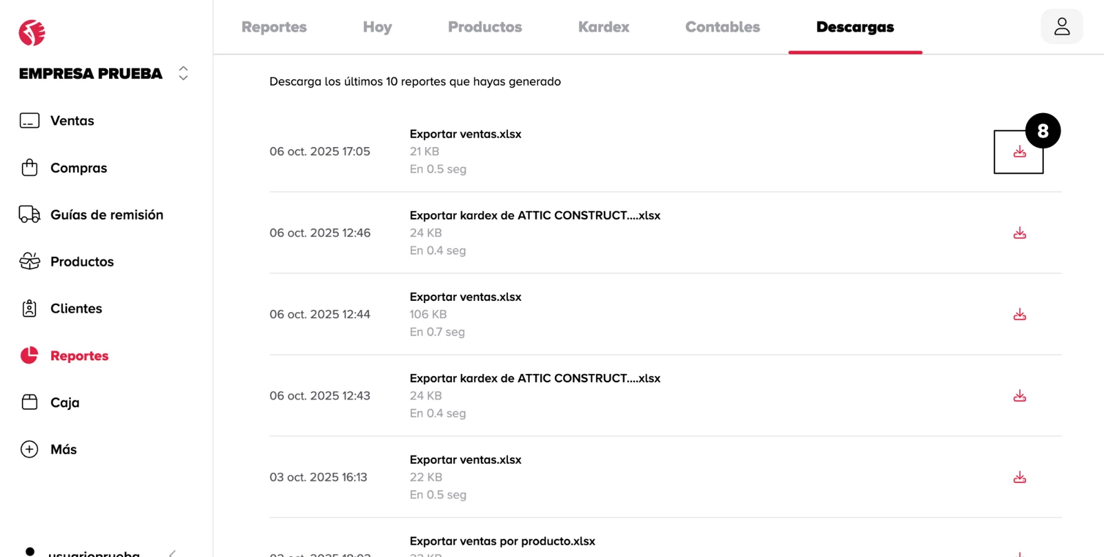 Puedes exportar reportes desde todos los módulos que cuenten con el 📥 icono de la flecha apuntando hacia abajo.