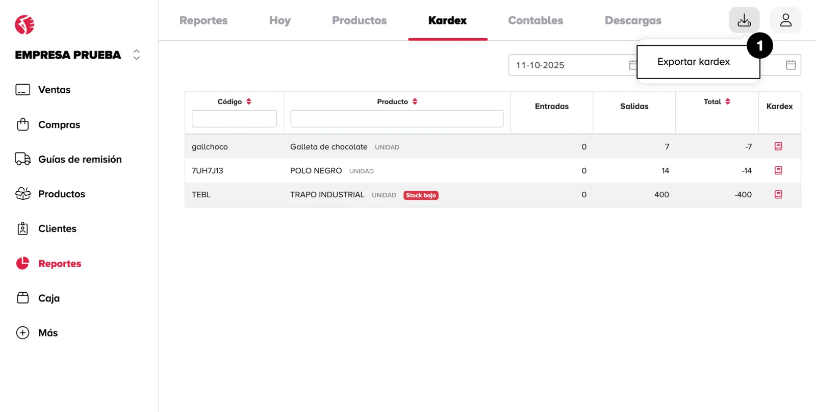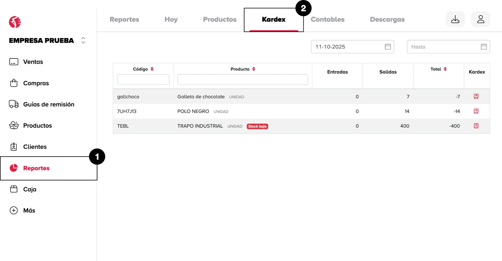 El reporte Kardex te permite revisar el movimiento de tus productos. Con este reporte puedes saber cuántas unidades ingresaron, salieron y cuál es tu stock disponible, en un rango de fechas establecidos.