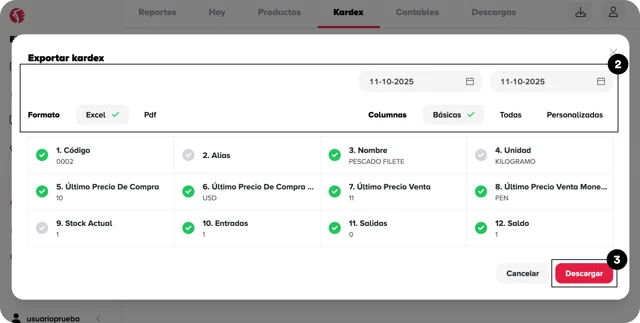 - Selecciona el rango de fechas, el formato (Excel o PDF) y las columnas que deseas que se muestre en el reporte.