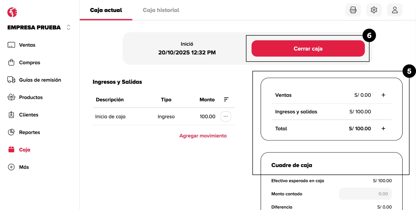 Una vez abierta, la caja registra automáticamente los movimientos de ventas, compras y gastos. También puedes agregar movimientos manuales para ingresos o salidas adicionales.